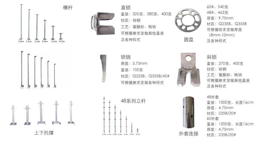 Nguyên liệu chính đều được làm bằng thép kết cấu hợp kim thấp (Q355B), có độ bền gấp 1,5–2 lần so với ống thép cacbon tròn (Q235B) của giàn giáo truyền thống.