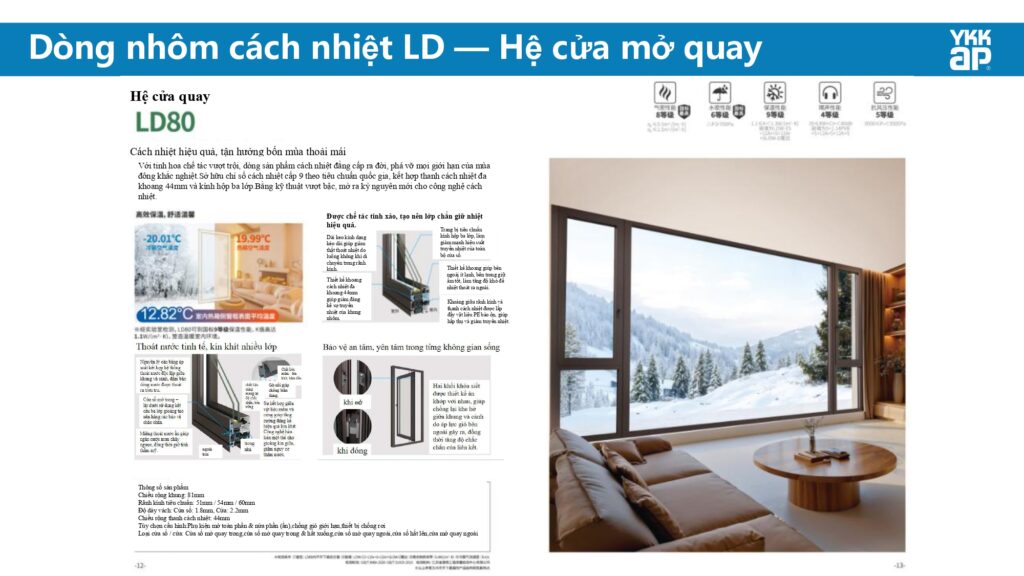 Nhờ sử dụng hệ gioăng EPDM khít tuyệt đối và kính hộp 2–3 lớp, cửa YKK AP giúp giảm tiếng ồn từ bên ngoài từ 40–60%, đồng thời cách nhiệt hiệu quả, giữ không gian bên trong luôn mát mẻ vào mùa hè và ấm áp vào mùa đông. Công nghệ Thermal Break giảm truyền nhiệt từ ngoài vào trong, giúp tiết kiệm chi phí điện năng đáng kể.